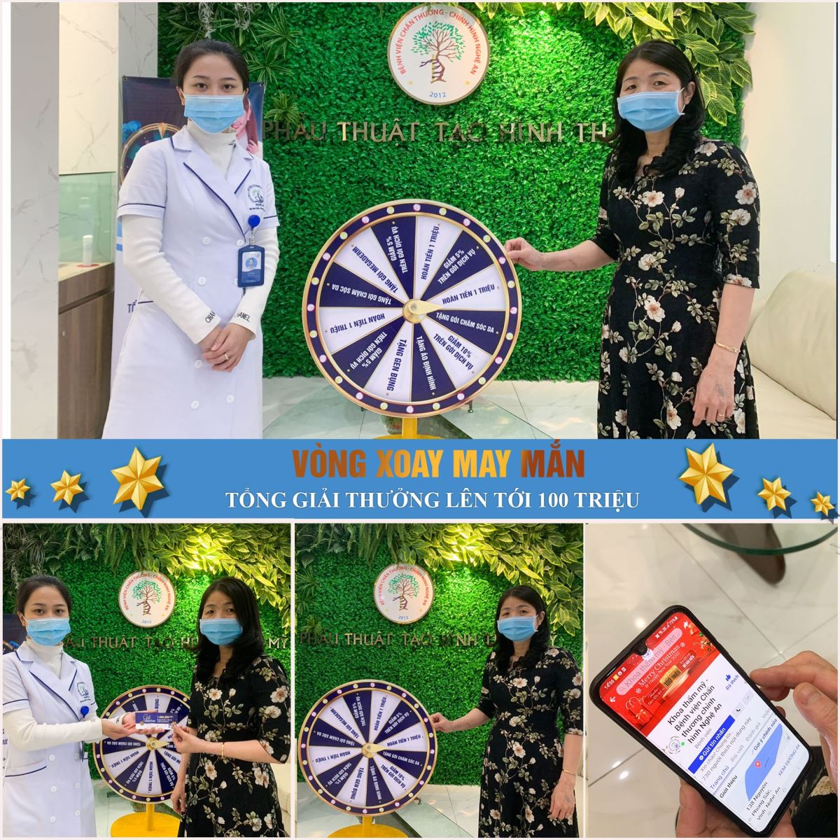 Để khách hàng thỏa sức làm đẹp nhân dịp Tết đến xuân về, Khoa Phẫu thuật tạo hình thẩm mỹ - Bệnh viện Chấn thương chỉnh hình Nghệ An cũng mang đến chương trình Vòng quay may mắn mở ra với rất nhiều voucher, quà tặng hấp dẫn. Cụ thể, từ 5/12/2021 - 5/1/2022, chương trình VÒNG QUAY MAY MẮN áp dụng cho tất cả khách hàng đến thăm khám, tư vấn trực tiếp và sử dụng dịch vụ tại Khoa.