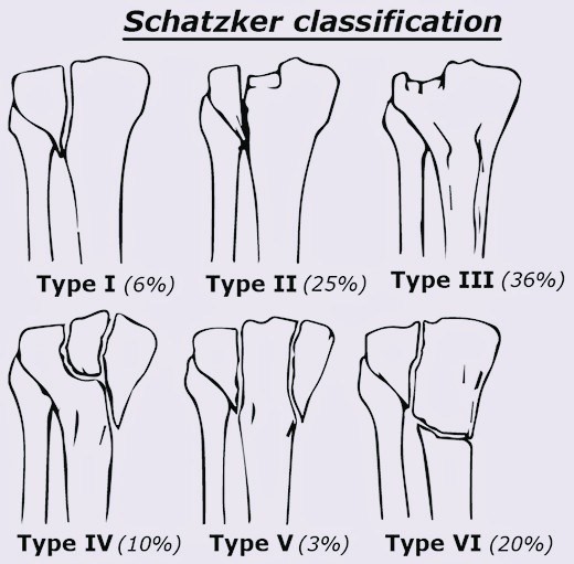 Bảng phân loại của tác giả Schatzker: được đưa ra năm 1979, đến nay vẫn được nhiều tác giả trên thế giới sử dụng phổ biến.
