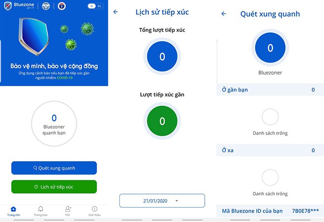 Với Bluezone, chỉ cần cài đặt trên smartphone và bật Bluetooth là mọi tiếp xúc đều được ghi nhận. Khi truy cập ứng dụng Bluezone, người dùng có thể thấy 2 tính năng quét xung quanh và lịch sử tiếp xúc. Trong đó, tính năng quét xung quanh có tác dụng như radar dò tìm, truy vết những người từng tiếp xúc bệnh nhân Covid-19.