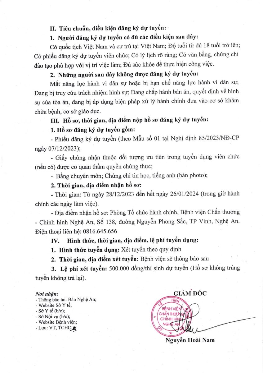 Bệnh viện Chấn thương Chỉnh hình Nghệ An xin thông báo tuyển dụng viên chức năm 2023 như sau: