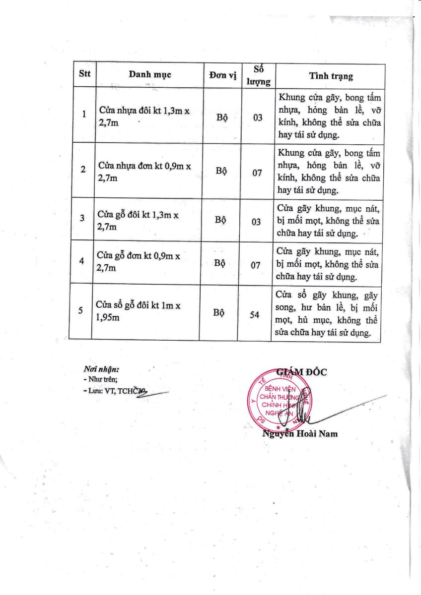 Bệnh viện Chấn thương - Chỉnh hình Nghệ An gửi thư yêu cầu báo giá: Gói thầu dịch vụ tư vấn: Thuê dịch vụ thẩm định giá các vật tư tháo dỡ từ công trình: Sửa chữa tầng 2 nhà 4 tầng như sau: